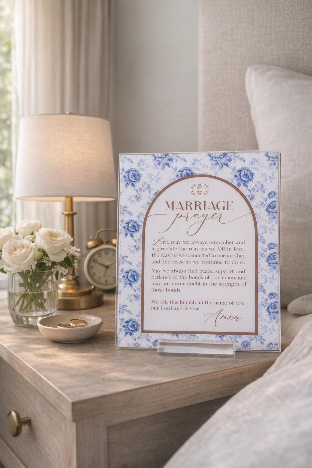 This beautiful Marriage Prayer plaque is a timeless keepsake designed to celebrate faith, commitment, and love. Thoughtfully created as a meaningful reminder of the promises made on a wedding day, it makes a heartfelt gift for newlyweds, anniversaries, or Christian home décor.
