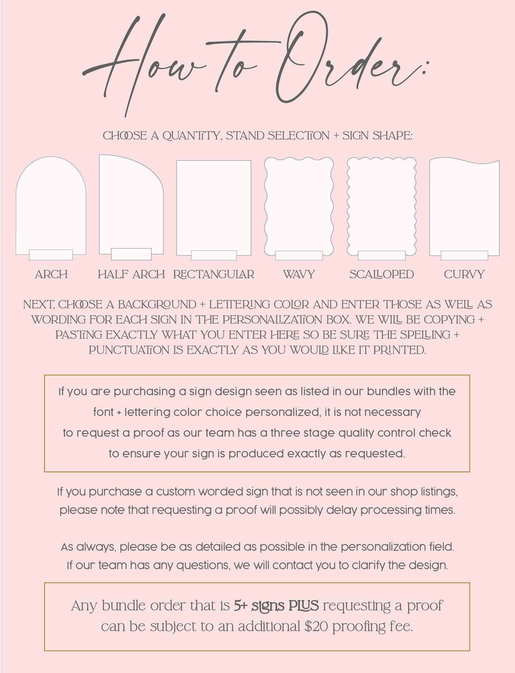 • In the customization section, simply specify your preferred lettering and background colors using the color swatches provided in the listing. Additionally, input your desired wording for each sign. You can either opt for our pre-designed examples or request custom text for a personalized touch. Please note that proofs will not be automatically generated unless explicitly requested, as this may extend processing time to accommodate approval and revisions. We're excited to craft this high-quality custom product for your special occasion!
