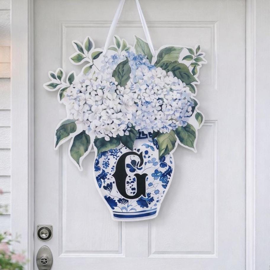 Add a charming pop of color to your front door, apartment, or business with this 20” chinoiserie hydrangea door hanger in soft blues and whites. Each sign is UV-printed on durable white 1/4" acrylic and comes ready to hang with white satin ribbon.