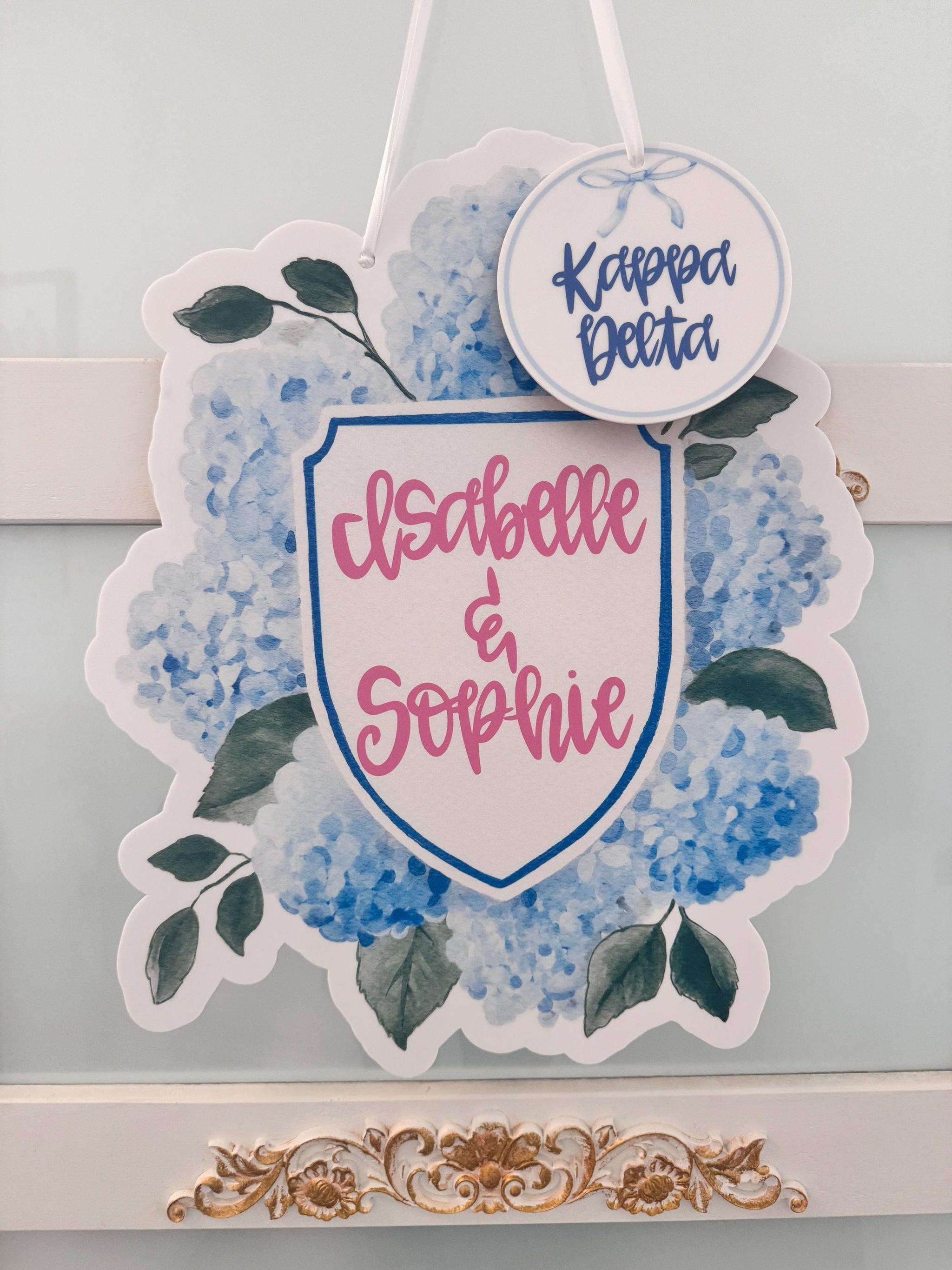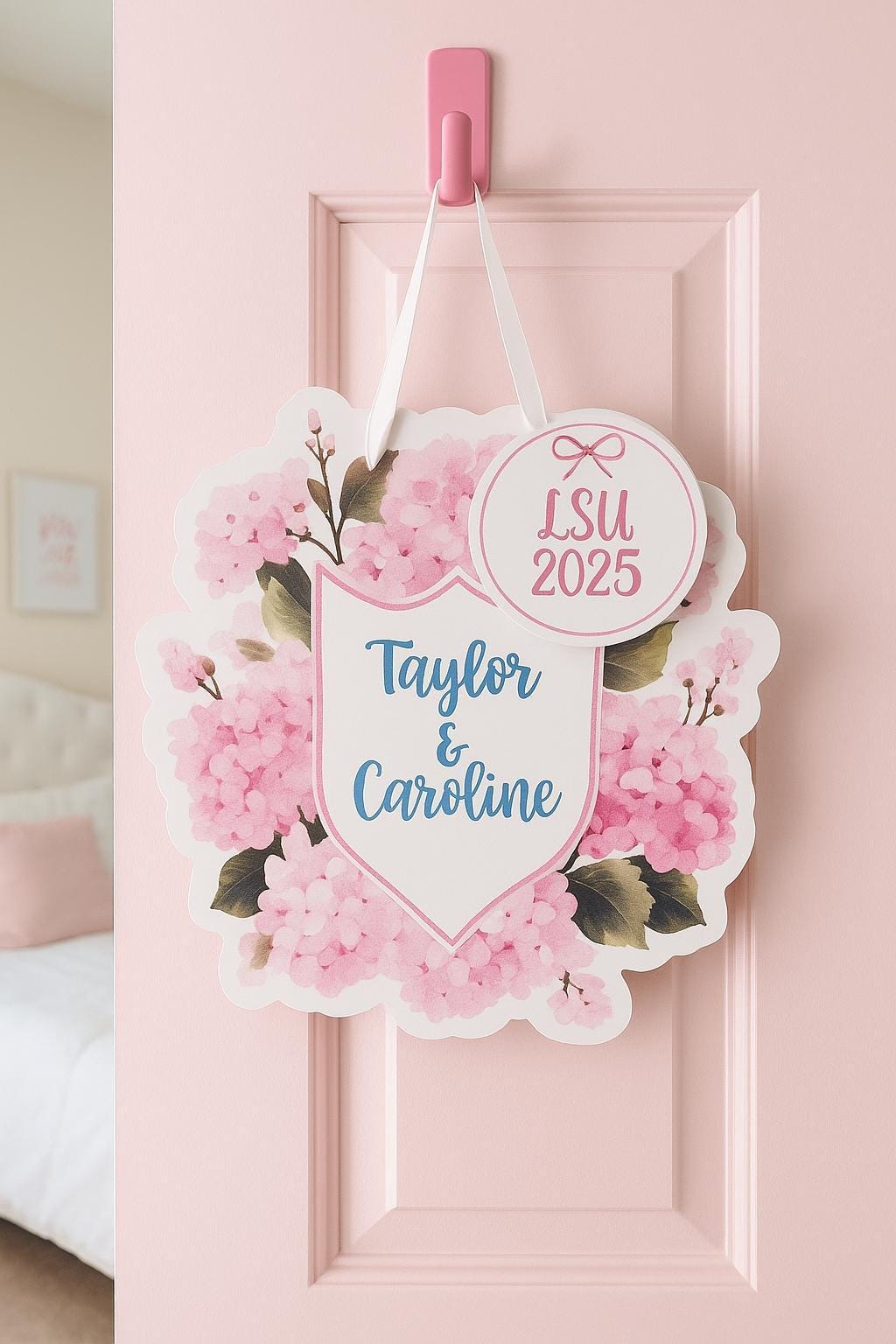 Add a charming pop of color to your dorm room, apartment, or front door with this 20” hydrangea coquette bow door hanger in soft pinks and blues. Each sign is UV-printed on durable white 1/8" acrylic and comes ready to hang with white satin ribbon.